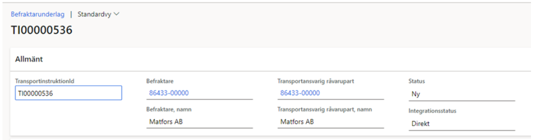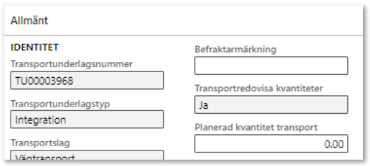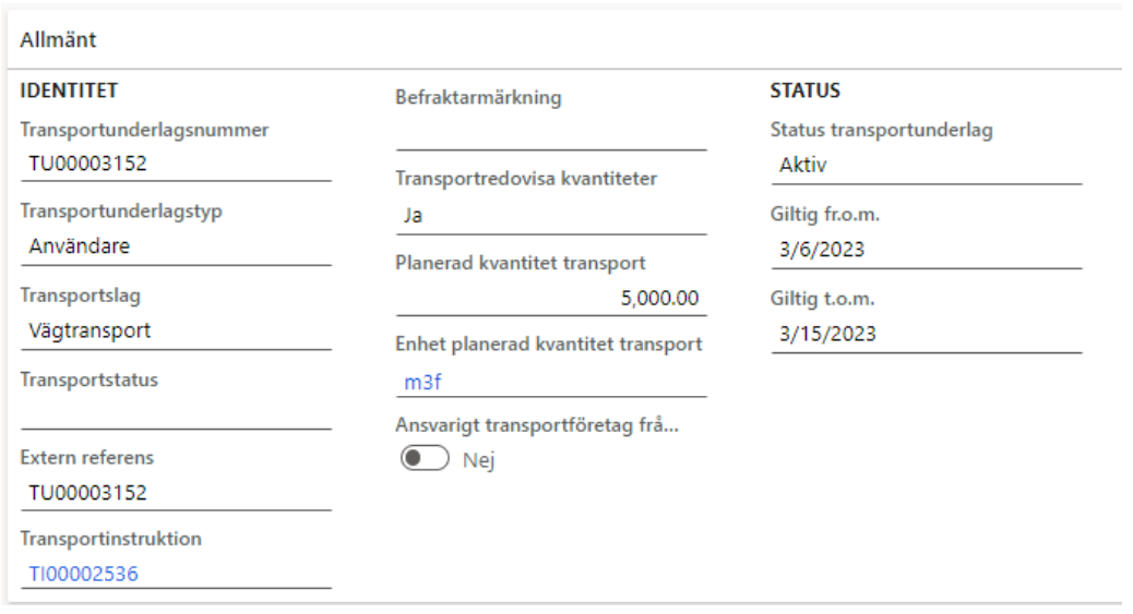 Den allmänna delen har, jämfört med för det systemskapade transportunderlaget fyllts på med information som angivits vid skapandet, eller integrerats in.