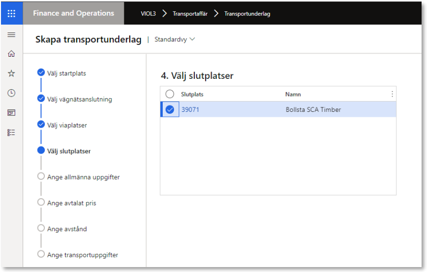 4. Nästa steg i guiden är att välja slutplats för transporten, vanligast är att slutplatsen är lika med den destinerade mottagningsplatsen. Men slutplatsen kan också vara en omlastningsplats, exempelvis i fall där biltransporten går till en järnvägsstation för omlastning till tåg. I dessa fall är det möjligt att ange en omlastningsplats som slutplats transport. I guiden visas vilka möjliga slutplatser som finns.