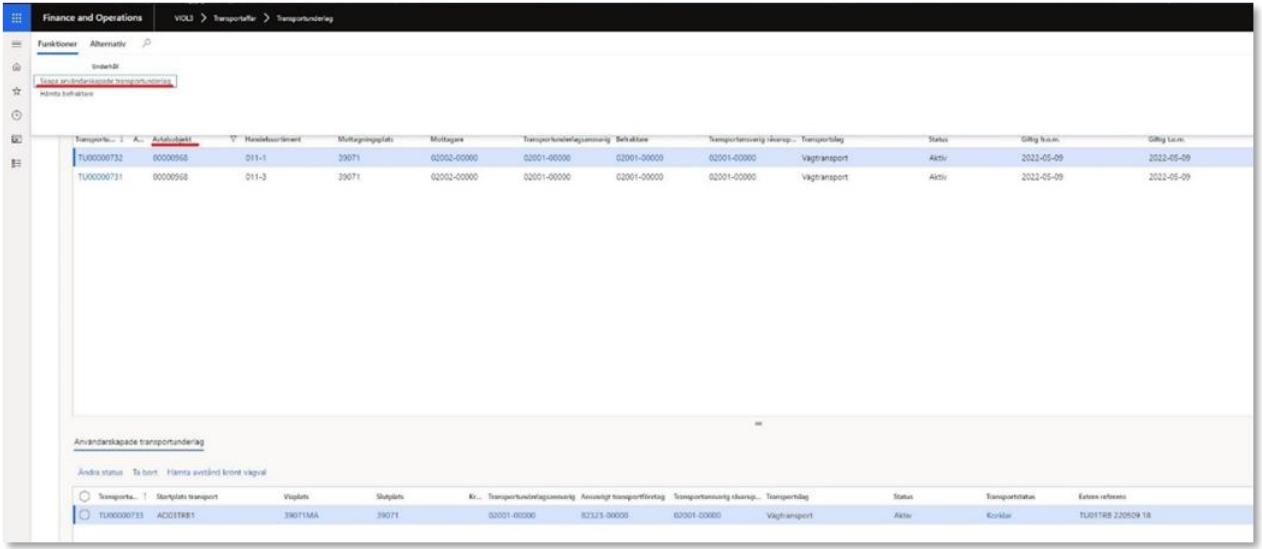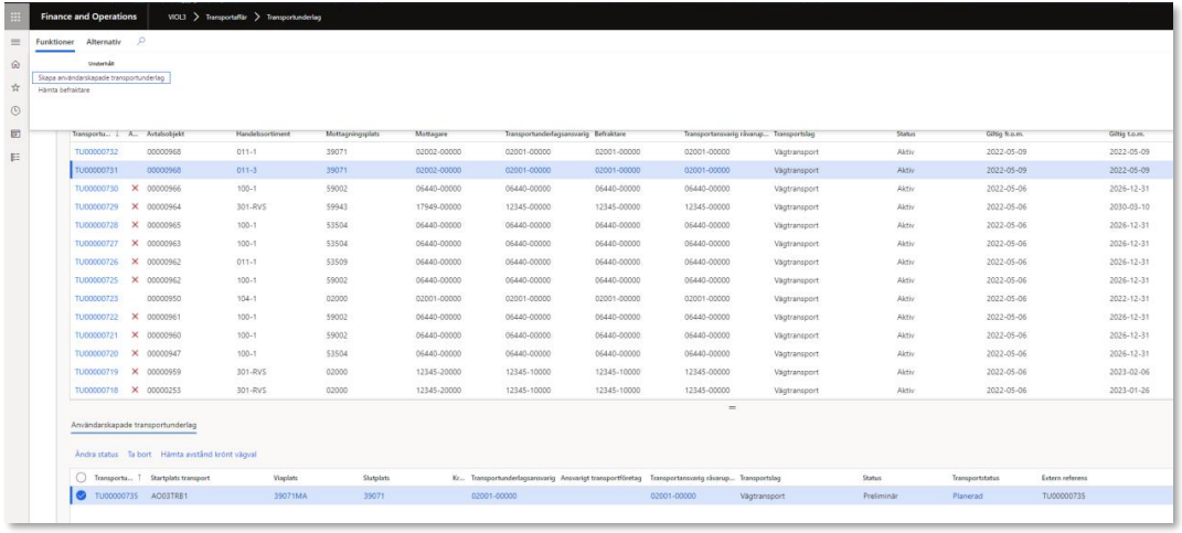 - Användaren kommer tillbaka till förteckningen där det systemskapade transportunderlaget som ursprungligen var markerat och i den nedre delen av bilden syns vilka användarskapade transportunderlag som är skapade