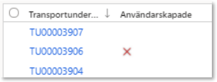 I kolumnen Användarskapade på den övre vyn med systemskapade transportunderlagen visas med ett rött kryss om inget användarskapat transportunderlag finns på aktuellt systemskapat transportunderlag. Om det inte finns något kryss betyder det att det finns användarskapade transportunderlag.