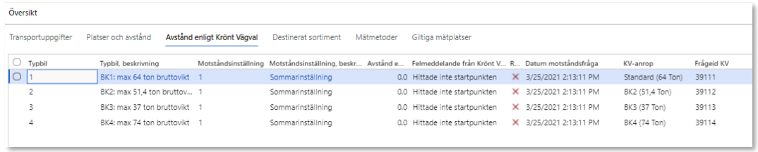 Visar att fråga ställts till Krönt Vägval men att inget avstånd finns för någon av de valda typbilarna/bärighetsklasserna som frågan ställts på.
