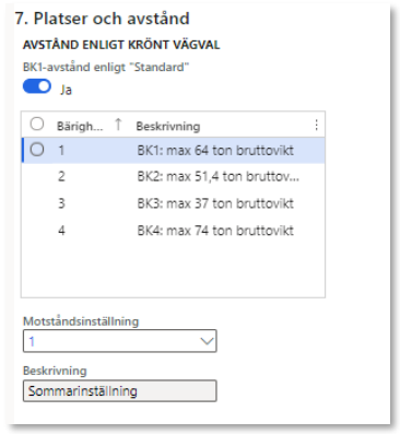 - Avstånd enligt Krönt vägval. Det är möjligt att ange för vilka typbilar/bärighetsklasser som Krönt-Vägval-avstånd ska hämtas, samt hur typbil/bärighetsklass 1 ska fungera.