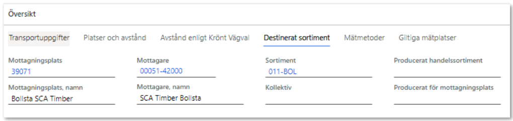 - Logistikeinformationsmottagare. Ärvs till det systemskapade transportunderlaget från avtalsobjektet. Den aktör som pekats ut som Logistikinformationsmottagare för avtalsobjektet för det handelssortiment eller den sortimentskategori där det destinerade sortimentet ingår, framgår på det systemskapade transportunderlaget.