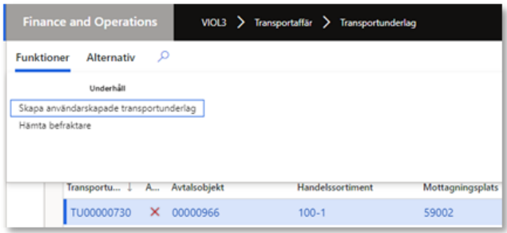 För att skapa ett eller flera användarskapade transportunderlag med hjälp av Skapa användarskapade transportunderlag, markeras ett systemskapat transportunderlag innan menyalternativet väljs. Det är också möjligt att skapa användarskapade transportunderlag på andra sätt.