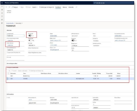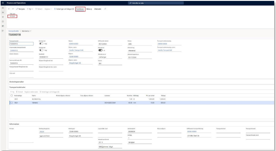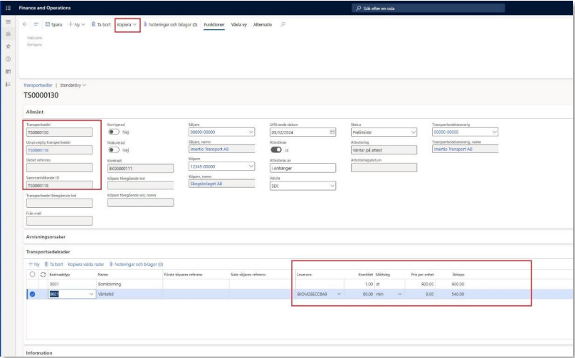 5. Följande vy dyker upp och här ser man den nya transportsedeln som skapats den har ett nytt ID men en koppling till den ursprungliga transportsedeln som är krediterad. Här gör man de ändringar som krävs. Efter detta följer man stegen i 3.2 Skapa transportsedel i två led för att kopiera återigen till led 2.