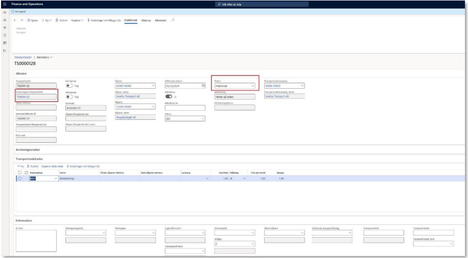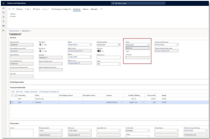 6. Väl inne på transportsedel i led ett så sätter man den i status Aktiv.