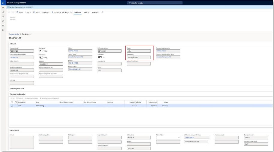 6. När man är klar med sin Transportsedel ändrar man statusen till aktiv och beroende på vilken part som skapar transportsedel och om det finns ett attestkrav i transportkontraktet, så kommer transportsedel få olika statuts. Är det köparen som skapar transportsedel så kommer ingen attest ske utan transportsedel blir automatisk attesterad oavsett om det finns attestkrav eller ej i kontraktet, och integreras därmed ut via affärsobjektet, Fakturaunderlag tilläggstjänster.