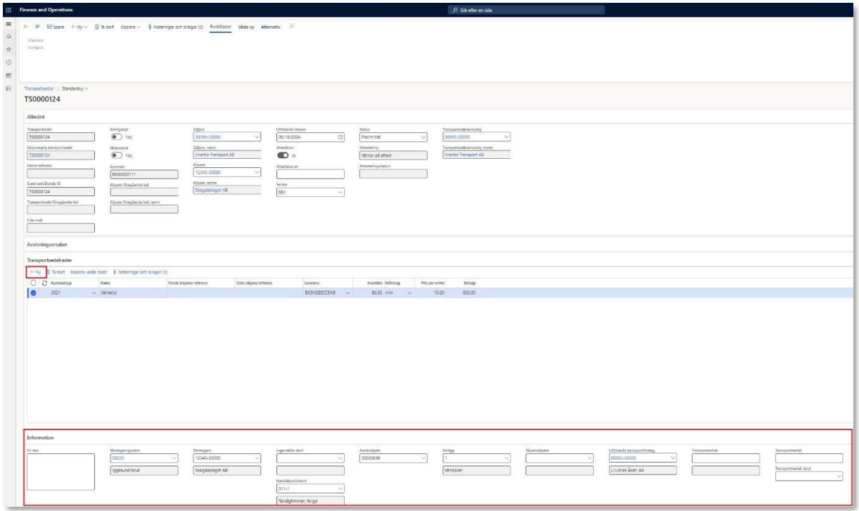 4. Under transportsedelsrader lägger man till de kostnadstyper transportsedeln avser genom att klicka på ”+Ny”. De uppgifter som är obligatoriska att fylla i på radnivå är: Kostnadstyp, Kvantitet, Måttslag samt Pris per enhet. På radnivå finns informationsfält kopplade, där ytterligare information kan registreras. Anges en specifik leverans på rad nivå kommer fälten i informationsfliken populeras med uppgifter kopplade till denna. I exemplet anges väntetid som kostnadstyp samt under rubriken ”Leverans” kopplar vi väntetiden mot en leverans som har redovisats mellan Köparen och säljaren av transportsedeln. Vi anger kvantitet måttslag samt pris per enhet och får då ett belopp. Observera att uppgifter kring leveransen fylls på i fältet ”Information” nedanför. Fältet information är kopplad till kostnadstypsraden. Lägger man till flera kostnadstypsrader kan man fylla på med information per rad. Här kan man komplettera med ytterligare valfri information förutom det som finns kopplat till leveransen.