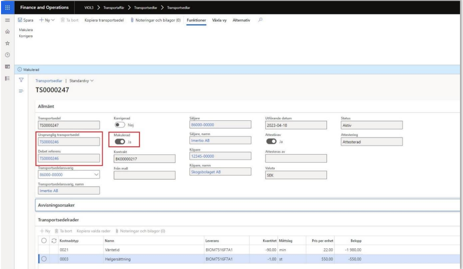 Transportsedel led två: Notera att identiteten på den transportsedel som vi valde att makulera visas i rutan ”Ursprunglig transportsedel” samt en ruta med ”Debet referens”, samt för led två sammanhållande ID och transportsedel i föregående led. Flaggan visar att detta är en makulerad transportsedel.