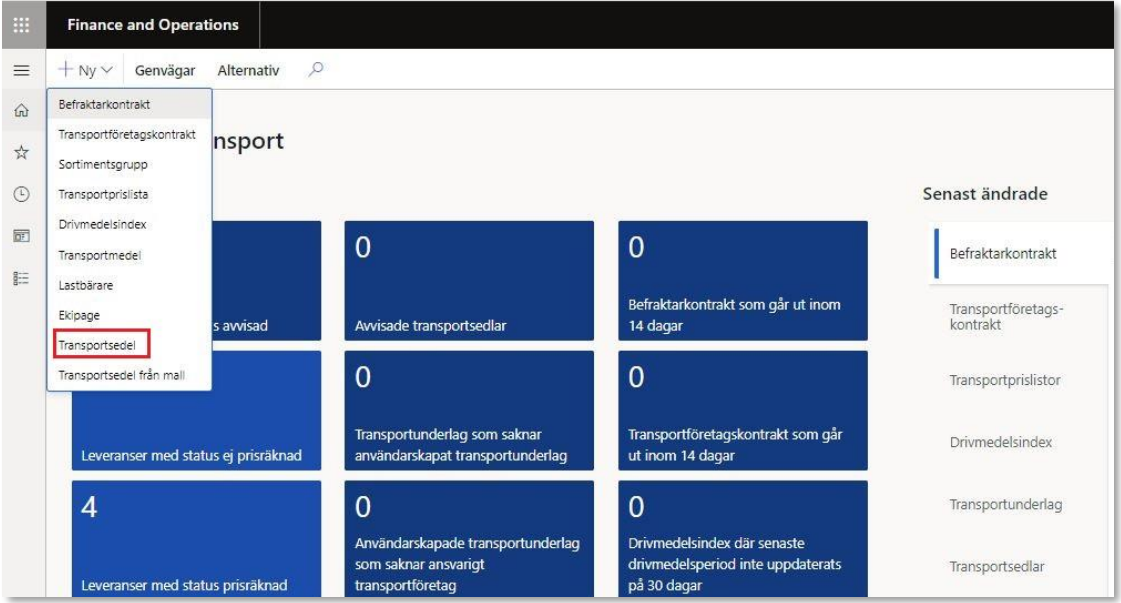 1. Utgå från Arbetsyta transport: -> ”+Ny” -> Transportsedel.