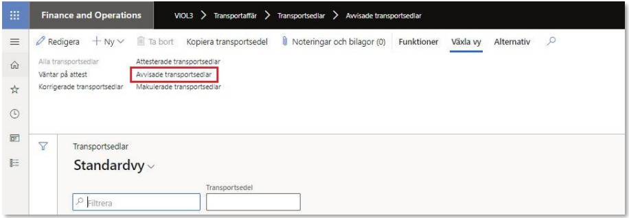 1. För att rätta till transportsedlar som blivit avvisade, gå från arbetsytan transport -> Genvägar ->Tranportsedlar -> Växla vy -> Avvisade transportsedlar. Alternativt klicka på notisen ”Avvisade transportsedlar” på arbetsytan för transport.