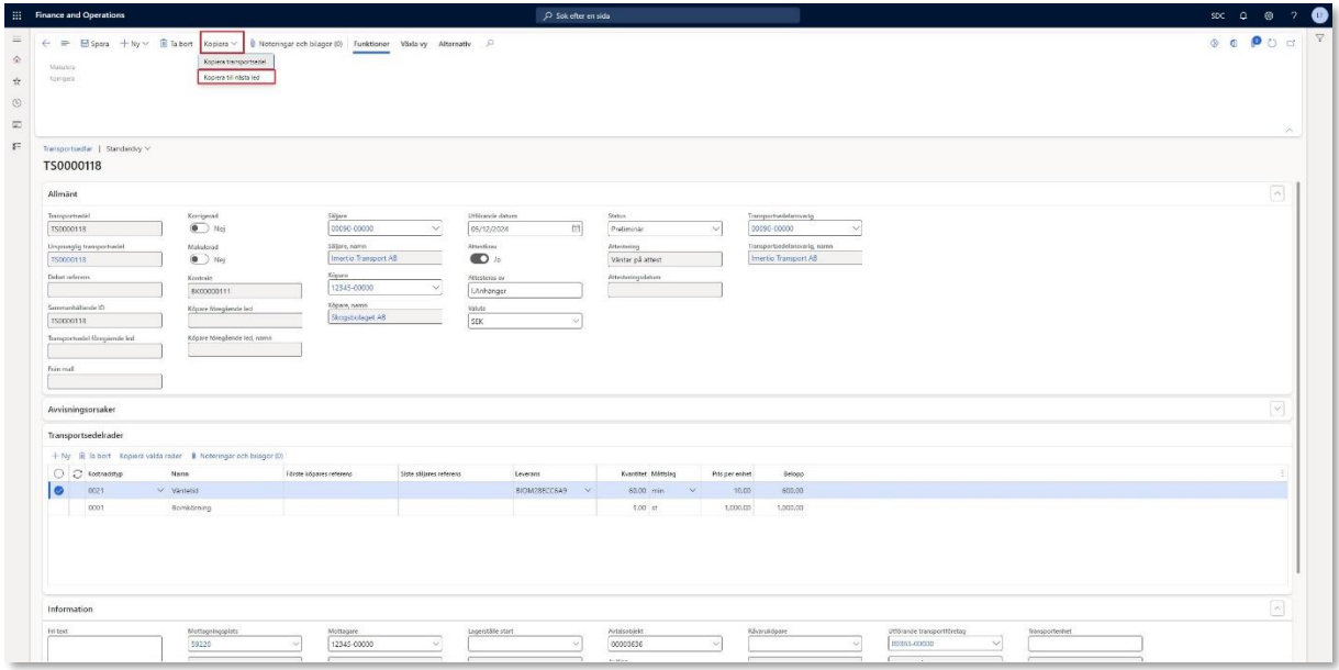 1. När ni har skapat er transportsedel enligt avsnittet Skapa Transportsedel, i första led av transportaffären mellan köpare och säljare samt att transportsedel har status preliminär då kan aktören som är säljare och transportsedelsansvarig kopiera denna till det utförande transportföretaget genom att klicka på ”Kopiera” -> ”Kopiera till nästa led ”.