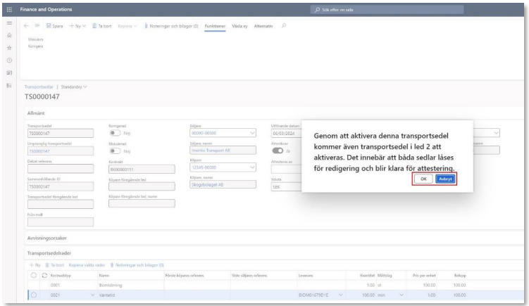 7. Vid aktivering av transportsedeln dyker följande ruta upp och gör användaren uppmärksam på att även transportsedeln i led två kommer aktiveras och då får köparen av transportsedeln i led ett får en notering om att det finns en transportsedel att attestera.