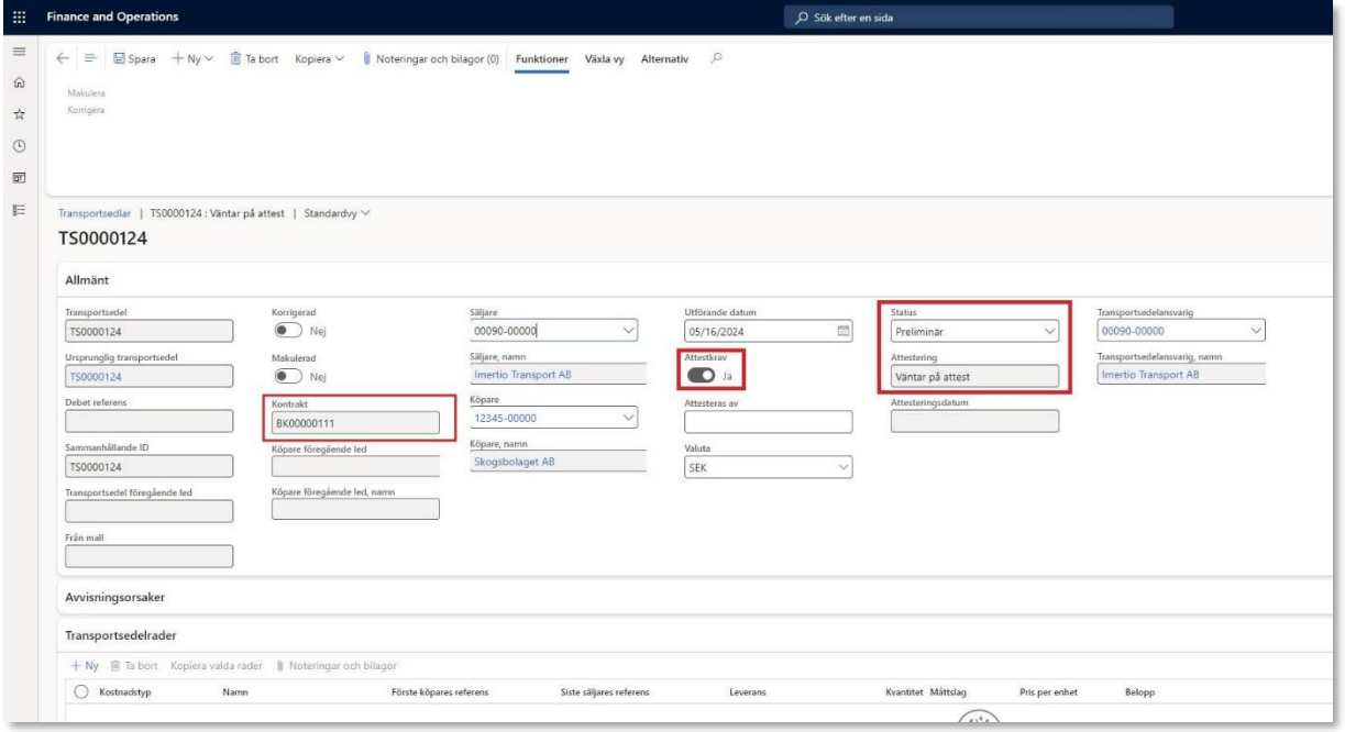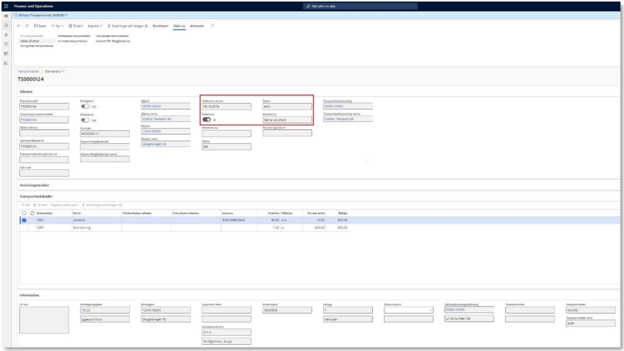 Är uppgifterna korrekta, godkänner attesterande part transportsedel. Detta sker genom att sätta den i status ”Attesterad” När transportsedel attesterats av köparen, integreras den ut via affärsobjektet, Fakturaunderlag tilläggstjänster till köpare och säljare.
