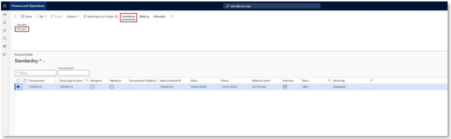 1. För att korrigera en transportsedel, gå från arbetsytan transport -> Genvägar ->Tranportsedlar -> Växla vy -> Attesterade transportsedlar.