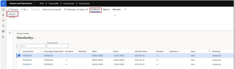 2. Välj en transportsedel som ska makuleras. OBS välj den som är i led ett.