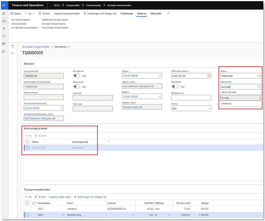 3. Vad som var orsaken till avvisningen sätts av köparen på transportsedeln under rubriken ”Avvisningsorsaker”. I transportsedeln utför man den rättning som behöver göras, samt sätter transportsedeln till status ”Aktiv”. Därefter får transportsedeln återigen Attesterings status - ”Väntar på attest”. Köparen får då en signal via notisen ”Transportsedlar som väntar på attests” att de måste agera.