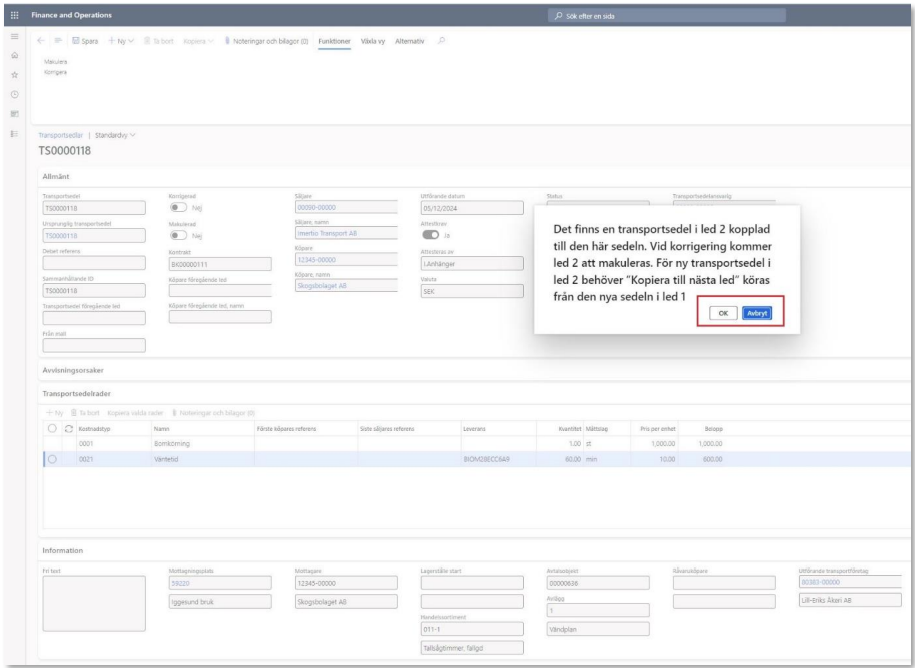 4. Följande ruta dyker upp och här klickar vi ok. Utför man en makulering i led ett av en transportsedel innebär det att man även makulerar led två.