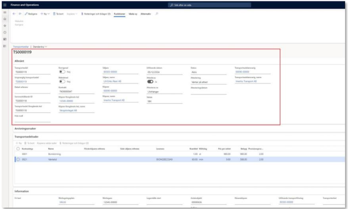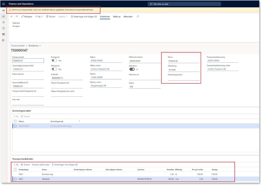 3. Notera att transportsedeln är avvisad samt det finns en varning om att man måste även ändra i led två innan man aktiverar i led ett. Gör de förändringar som krävs och gå sedan till transportsedeln i led två. I vårt fall var priset på Bomkörning fel.