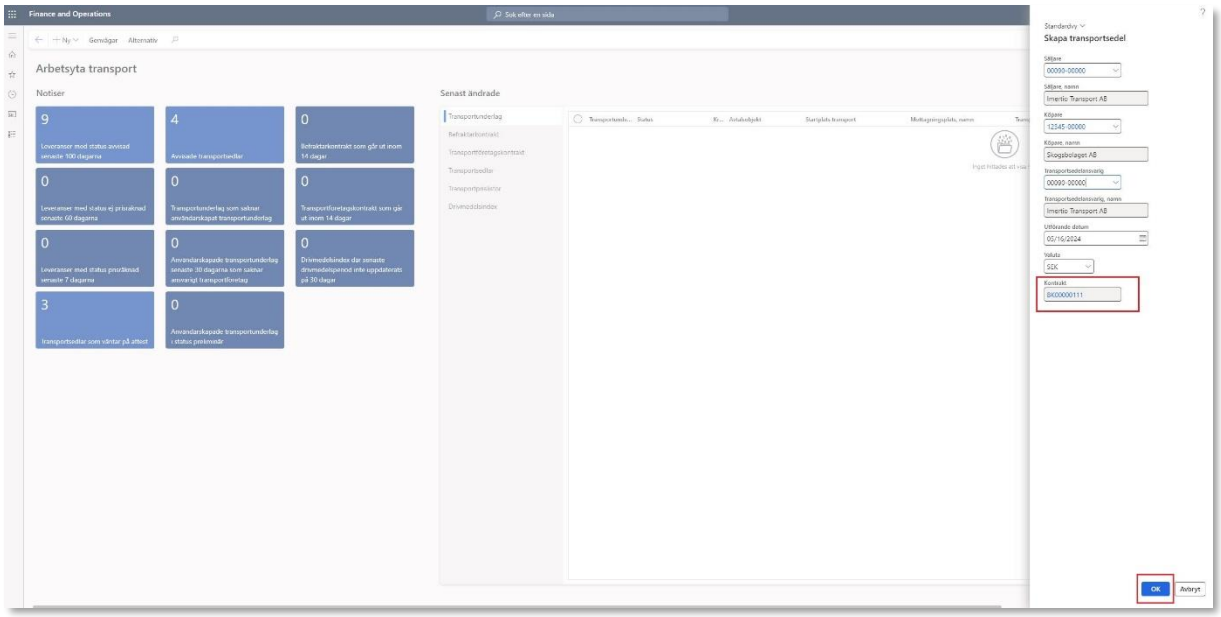 2. Följande formulär visas. För att kunna skapa en transportsedel är förutsättningen att ett befraktarkontrakt eller transportföretagskontrakt finns på plats i mellan parterna och att attestkrav är antingen ”JA” eller ”NEJ” på kontraktet. Har man ”JA” måste köpande part godkänna Transportsedel genom att attestera. Fyll i relevant information om vem som är köpare, säljare och transportsedelsansvarig av transportsedeln samt utförande datum, valuta och tryck sedan ”OK”.