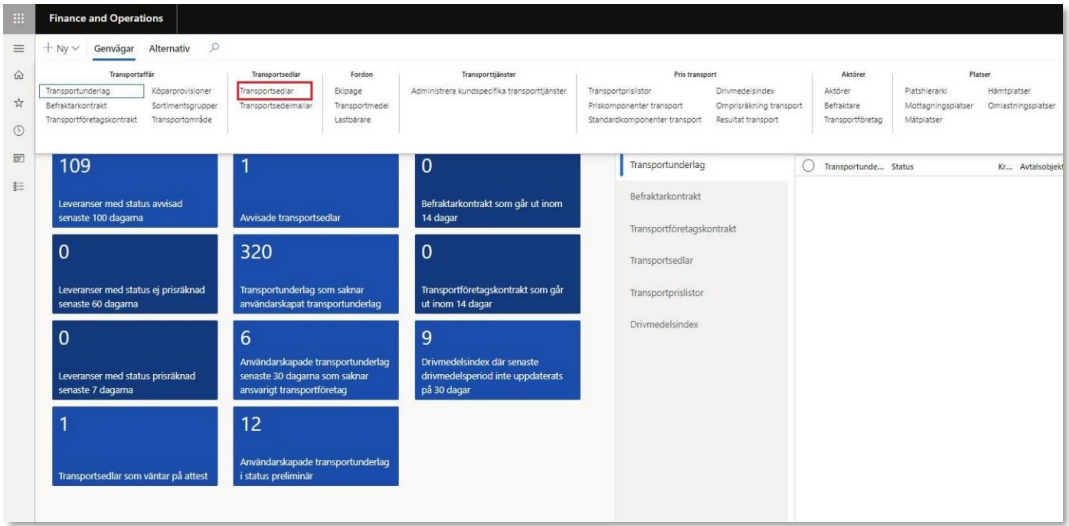 1. Utgå från Arbetsyta transport: ->Genvägar -> Transportsedlar -> Välj Transportsedelmallar.