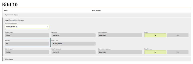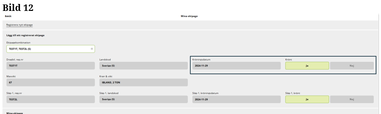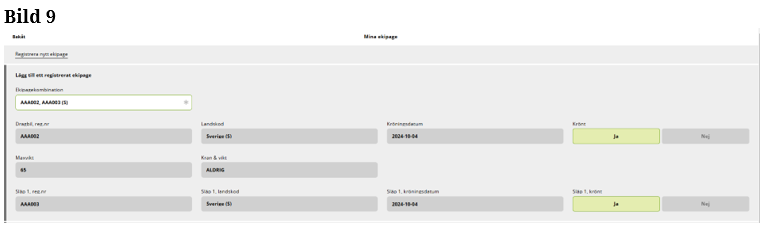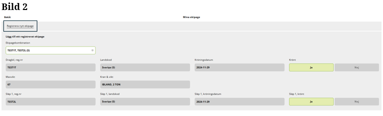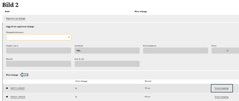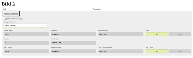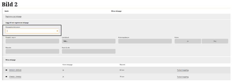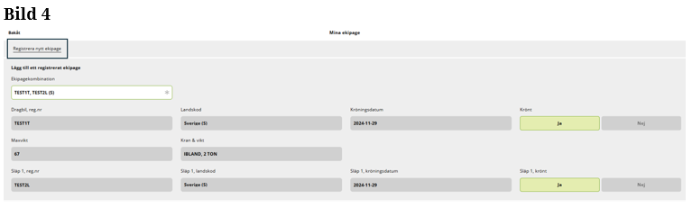 Är ekipaget inte upplagd på Mina ekipage kommer du åt vyn genom att ”klicka” på Registrera nytt ekipage. (Bild 4)