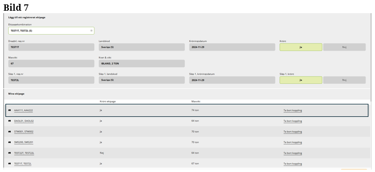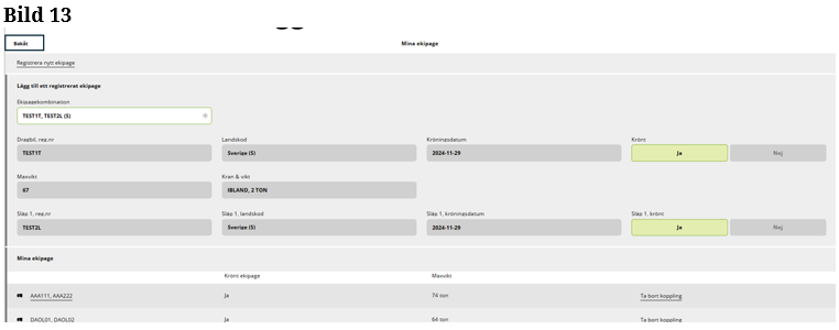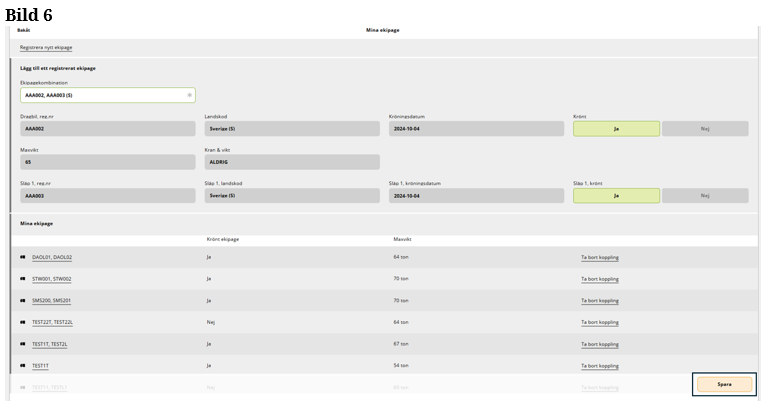 Välj det ekipage som stämmer överens med ditt registreringsnummer på bil och släp. Klicka ”spara” för att ekipaget ska bli sparat till Mina ekipage. (Bild 6)
