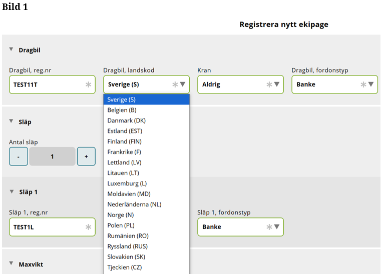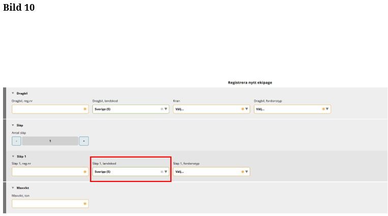Fyll i landskod på släp 1. (Bild 10)