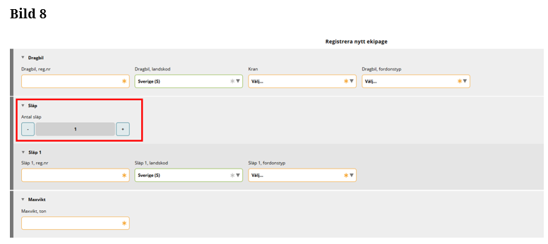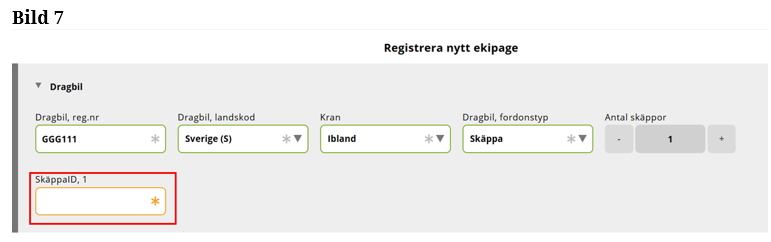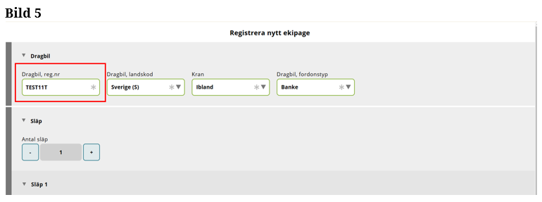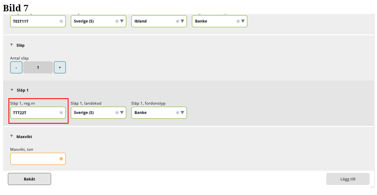 Fyll i hela registreringsnummer på släp 1. (Bild 7)
