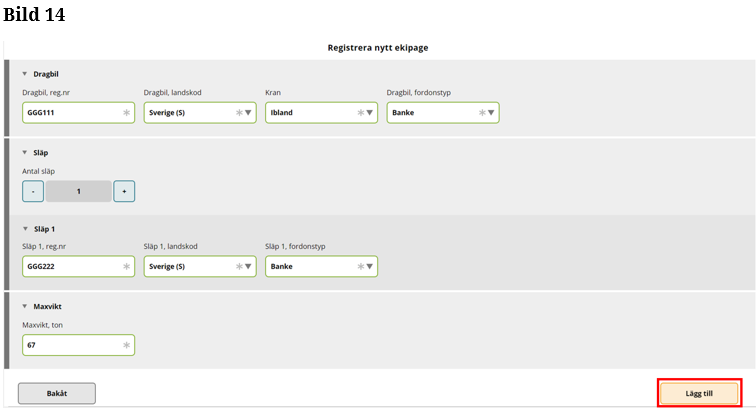 När alla obligatoriska fälten är klar lägger du till ditt ekipage. ”Klicka” Lägg till. (Bild 14)