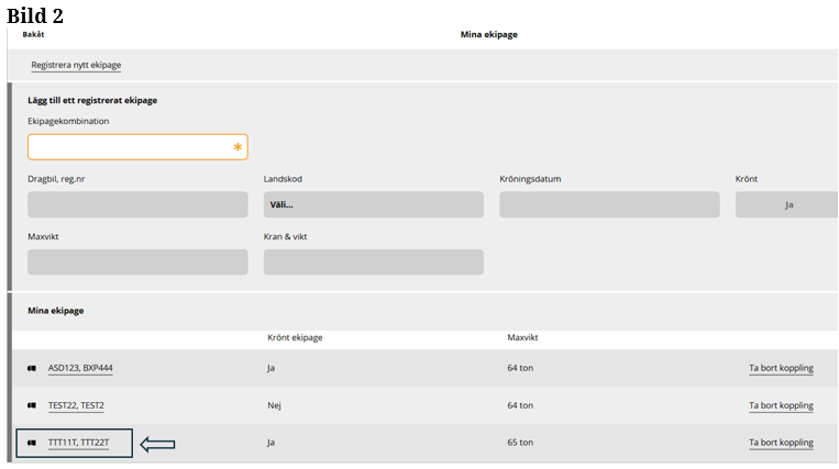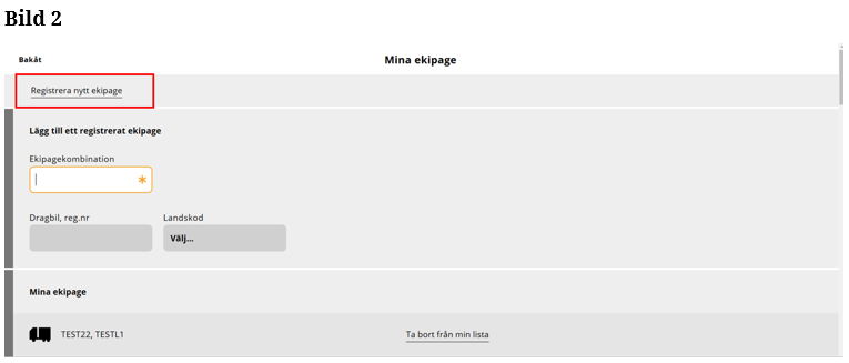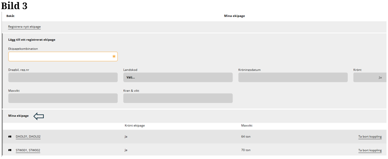 Du söker efter en ekipagekombination i sökrutan för att lägga till ekipaget i mina ekipage och ekipaget finns inte som alternativ. (Bild 1) Du behöver då lägga upp ett nytt ekipage. Finns dragbilen, men inte släpet, behöver du lägga upp ett nytt ekipage.