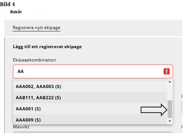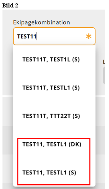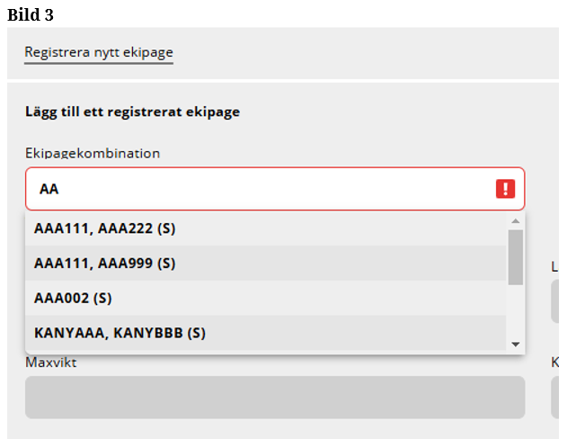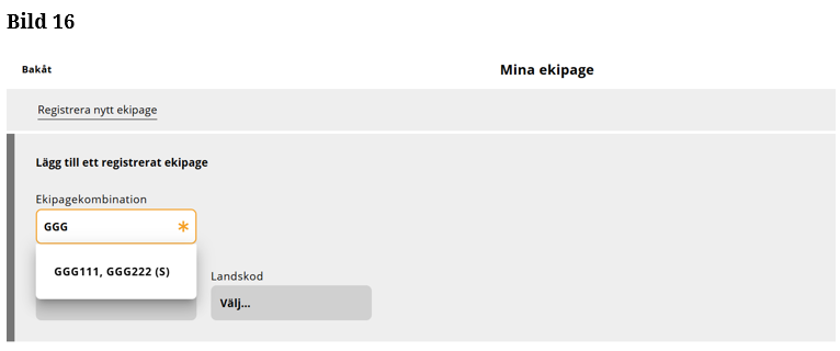 Sök i Ekipagekombination efter det nya ekipaget, som du har lagt upp i registret. (Bild 16)