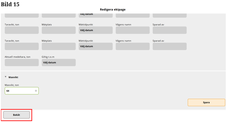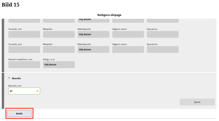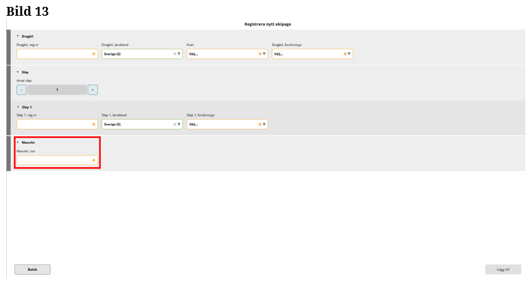 Fyll i maxvikt på ekipaget som är högsta tillåtna med last. (Bild 13)