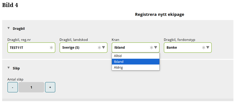 När du lagt in ditt registreringsnummer på dragbilen kommer det upp information hur dragbilen ser ut. (Bild 4) Under Kran finns en rullist, där kan du välja inställning: