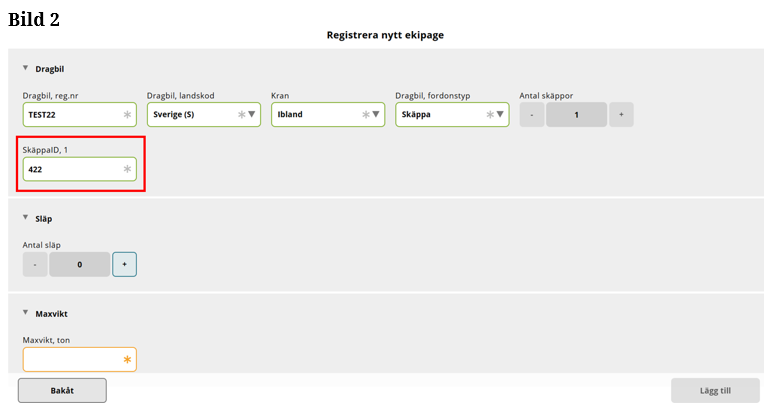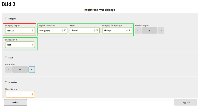 Fyll i hela registreringsnummer på dragbilen. När hela registreringsnummer är ifyllt i röda boxen på bilden, kommer uppgifterna upp om dragbilen och vilken skäppa som dragbilen har. Informationen finns i de gröna inringade fälten på bilden. (Bild 3)