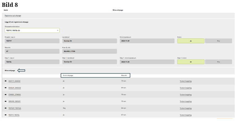 När du lagt in ditt registreringsnummer på släp 1, kommer det upp information hur släp 1 ser ut. (Bild 8)