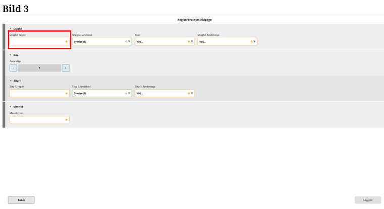 Fyll i hela registreringsnummer på dragbilen. (Bild 3)