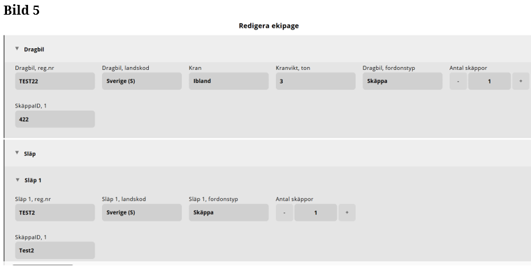 - OBS! Vi stödjer endast två registreringsnummer på ett ekipage. Ett registreringsnummer för dragbil och ett registreringsnummer för släp. För mer information läs dokumentation om Information om Ekipagetyper.