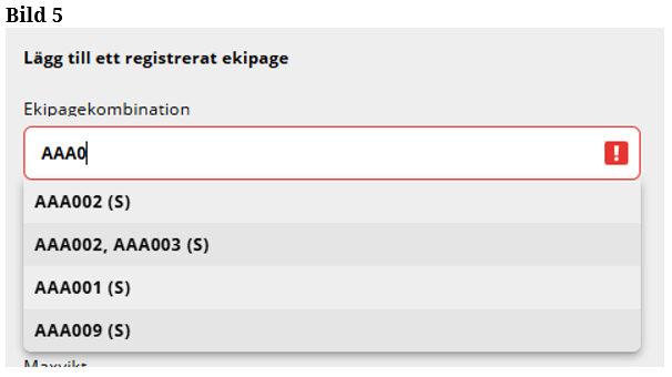 Lägger du till ytterligare tecken i sökrutan så minskar urvalet av ekipage i listan. (Bild 5)